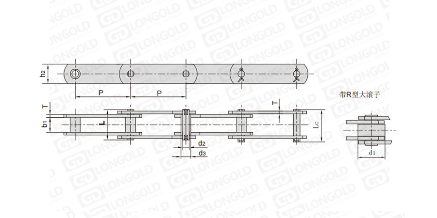 上圖為帶R滾子FV系列標(biāo)準(zhǔn)輸送鏈的結(jié)構(gòu)圖。