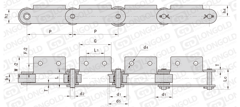 此種輸送鏈?zhǔn)怯呻p節(jié)距鏈條衍生而來(lái)的,鏈條節(jié)距為非常用規(guī)格,通過(guò)裝備特殊附件使鏈條滿(mǎn)足特定的工作需求