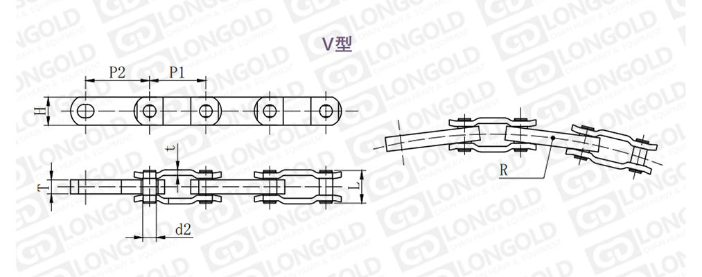 鏈條的外鏈板為折彎形狀,內(nèi)鏈板通過(guò)鍛造而成,通過(guò)特殊的設(shè)計(jì)使得鏈條可以在兩個(gè)平面旋轉(zhuǎn)運(yùn)輸或沿多個(gè)方向運(yùn)輸。