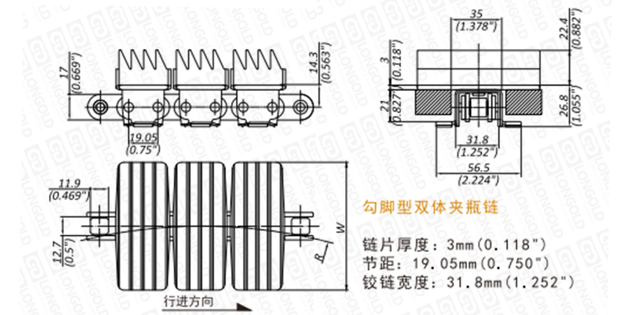 上圖為LDGV1874T系列雙體鏈的結(jié)構(gòu)圖,圖紙已標明本體尺寸。