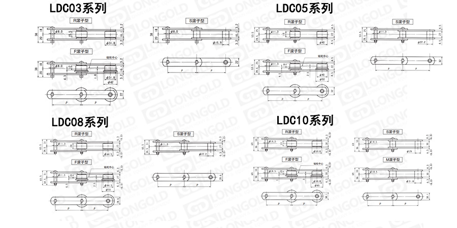 上圖為本體鏈條LDC03、LDC05、LDC08以及LDC10規(guī)格輸送鏈的結構圖。