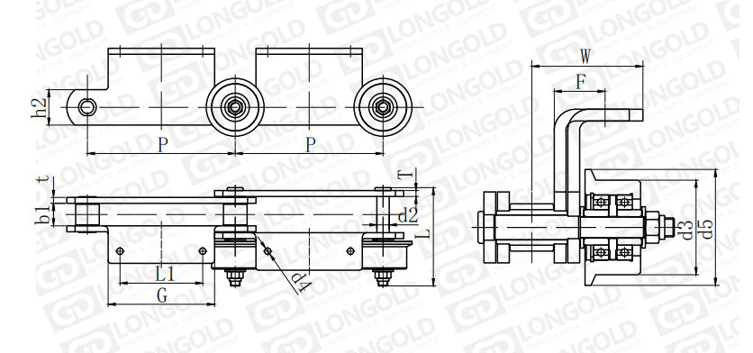 鏈條一側(cè)帶側(cè)置F滾輪,同時鏈條帶A2附件,即鏈板一側(cè)帶折彎板,折彎板上有兩個孔。