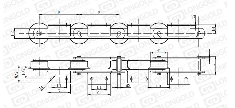 鏈條帶A2附件,即鏈條一側帶折彎板,折彎板上帶兩個孔。