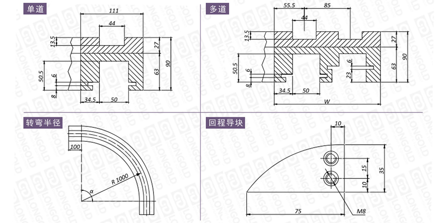 在選擇軌道時(shí),需要考慮安裝尺寸、材質(zhì)性質(zhì)、轉(zhuǎn)彎角度等因素,如有需要,請咨詢隆德技術(shù)人員。