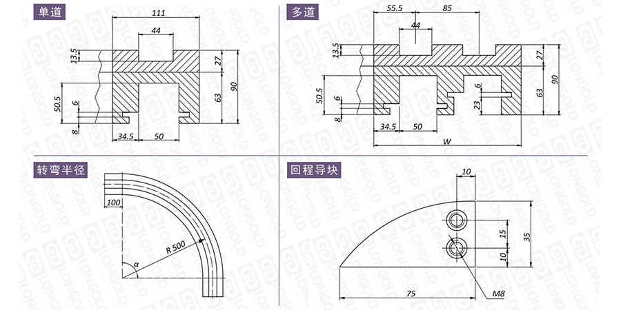 在選擇軌道時,需要考慮安裝尺寸、材質性質、轉彎角度等因素,如有需要,請咨詢隆德技術人員。
