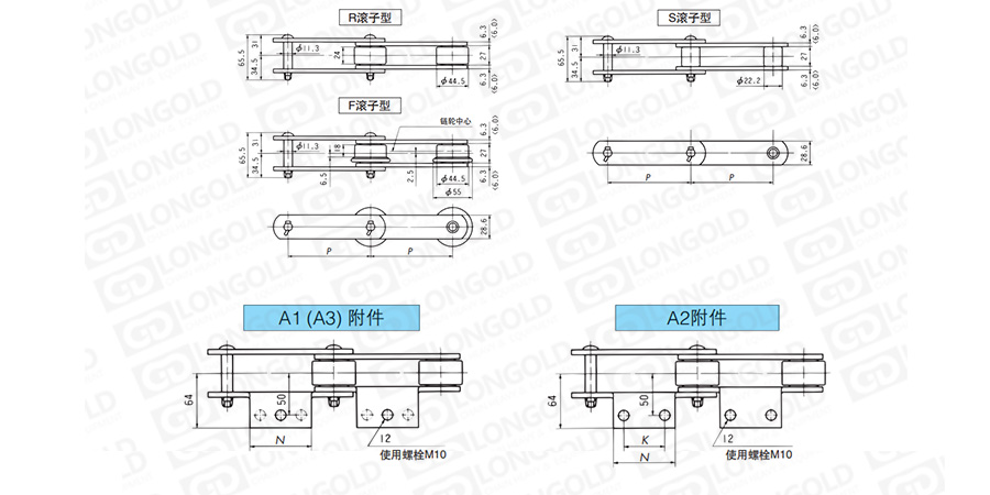 上圖為帶A附件LDC08125~LDC08150規(guī)格輸送鏈的結(jié)構(gòu)圖以及帶附件結(jié)構(gòu)圖。