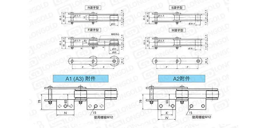 在大型輸送鏈條12200·12250的單側(cè)加裝折彎板附件的鏈條。附件是為了將夾具安裝在鏈條上的零部件,附件安裝間隔可設(shè)定為每節(jié)帶附件,也可定制安裝間隔。附件上帶有1個(gè)或者2個(gè)或者3個(gè)孔,附件表示為:A1、A2、A3。