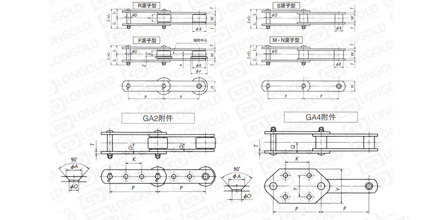 在LDC36250~LDC440600米制節(jié)距大型輸送鏈條的單側作特殊形狀和開孔的鏈條。附件是為了將夾具安裝在鏈條上的零部件,可根據客戶要求設定安裝間隔。附件表示為:GA2、GA4。