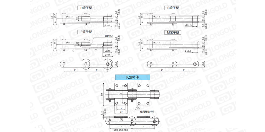 在大型輸送鏈條26200·26250·26300的兩側(cè)帶折彎板附件。附件是為了將夾具安裝在鏈條上的零部件,可根據(jù)客戶要求設(shè)定安裝間隔。附件上帶有2個孔,附件表示為:K2。