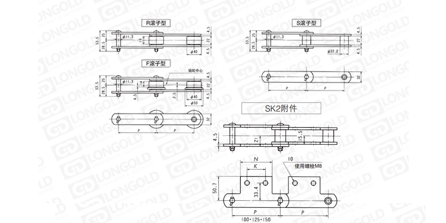 上圖為帶SK2附件LDC05100~LDC05150規(guī)格輸送鏈的結(jié)構(gòu)圖以及帶附件結(jié)構(gòu)圖。