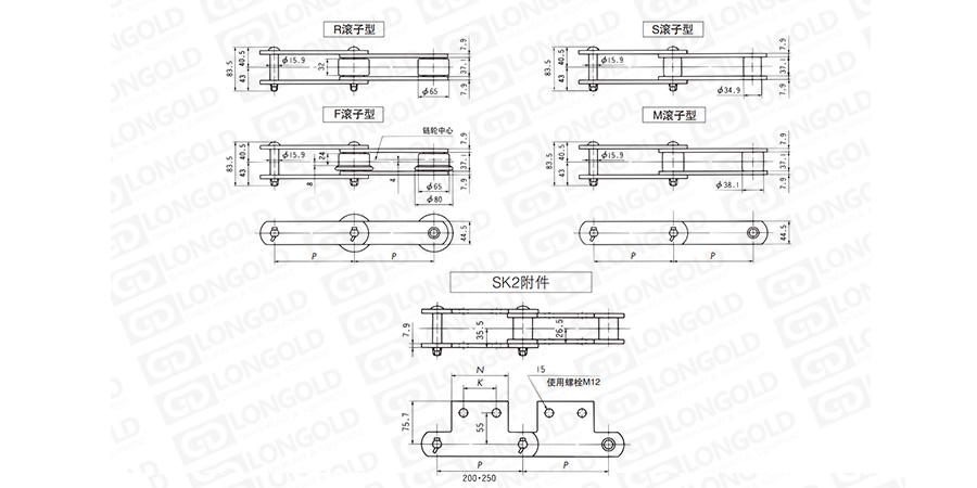 上圖為帶SK2附件LDC12200~LDC12250規(guī)格輸送鏈的結(jié)構(gòu)圖以及帶附件結(jié)構(gòu)圖。