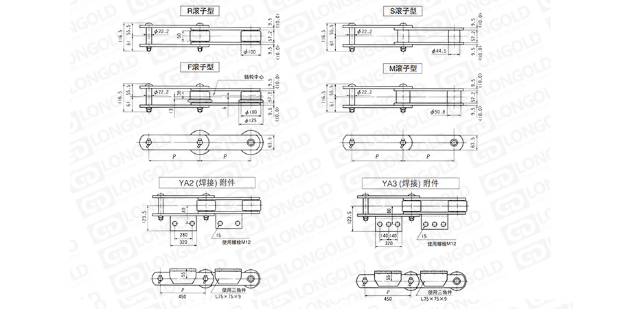 在大型輸送鏈條26450的單側(cè)鏈板焊接附件的折彎板附件的鏈條。附件是為了將夾具安裝在鏈條上的零部件,可根據(jù)客戶要求設(shè)定安裝間隔。附件上帶有2個(gè)或3個(gè)孔,附件表示為:YA2、YA3。