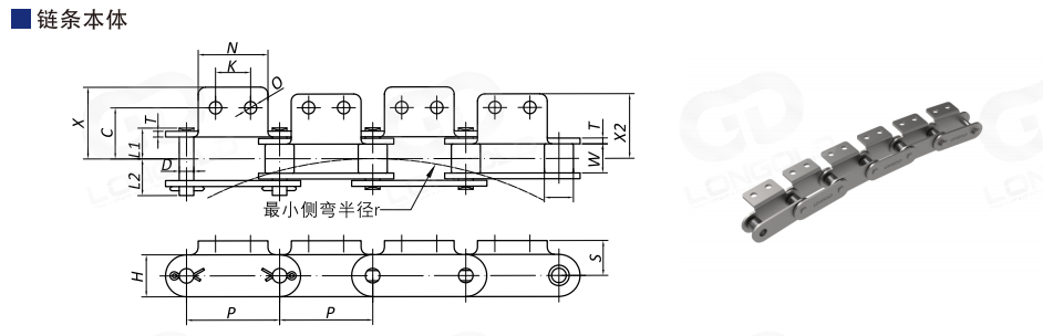 側(cè)彎鏈條即可作為傳動(dòng)鏈?zhǔn)?,?可以安裝附件?于輸送。