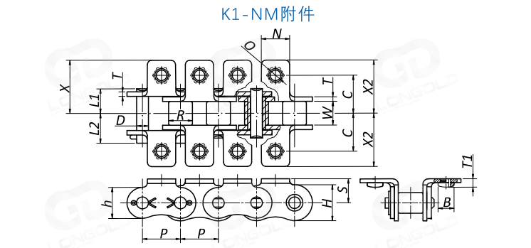鏈條兩側(cè)帶有單孔折彎板附件,且附件上裝有螺母,附件表示為K1-NM。