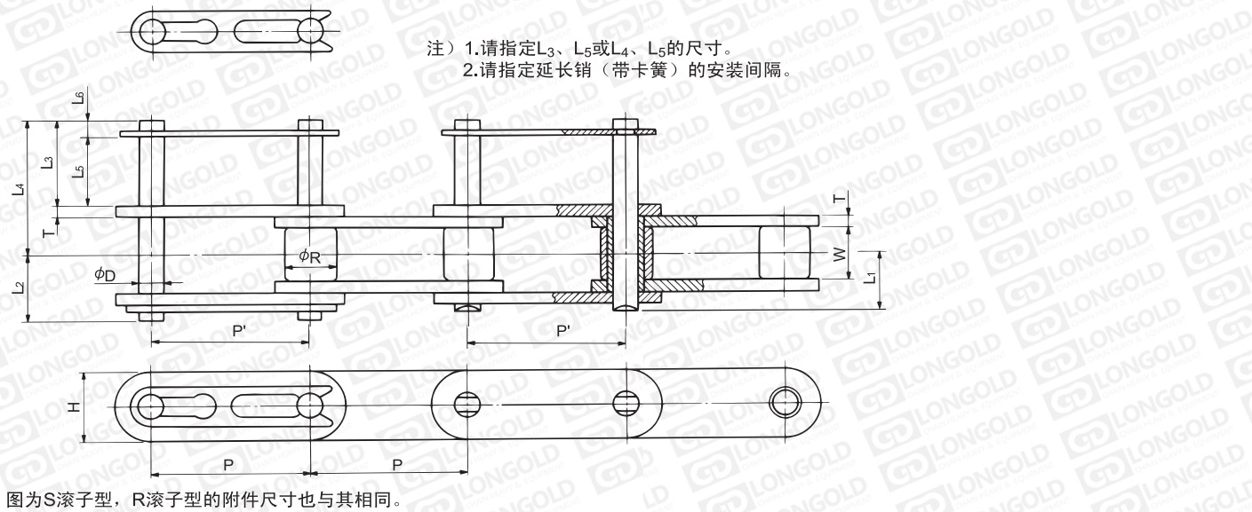上述產(chǎn)品圖片為S滾子每一節(jié)帶延長(zhǎng)銷的情況。