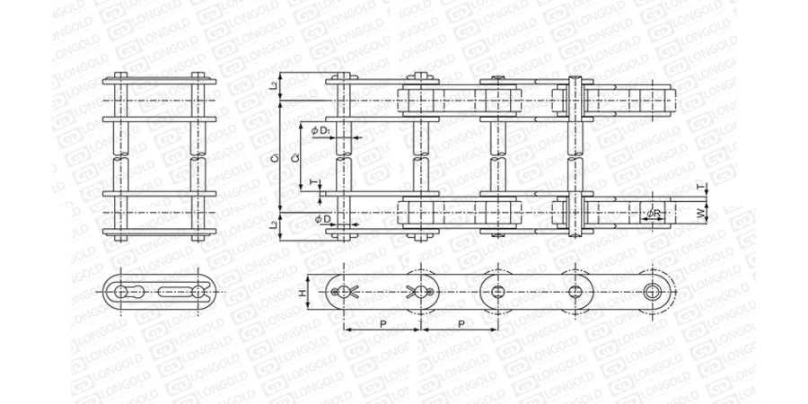 上圖為帶支柱銷(xiāo)A雙倍節(jié)距鏈結(jié)構(gòu)圖。