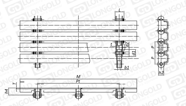 帶頂置平整矩形附板,由三排本體鏈條組合而成。