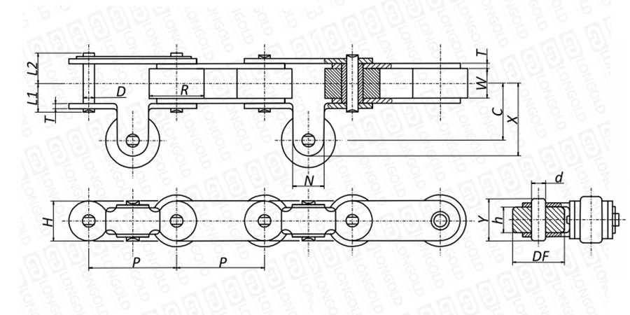 本體鏈條為標(biāo)準(zhǔn)滾子鏈條,單側(cè)帶具有導(dǎo)向作用的滾輪,有利于防止鏈條蛇形。