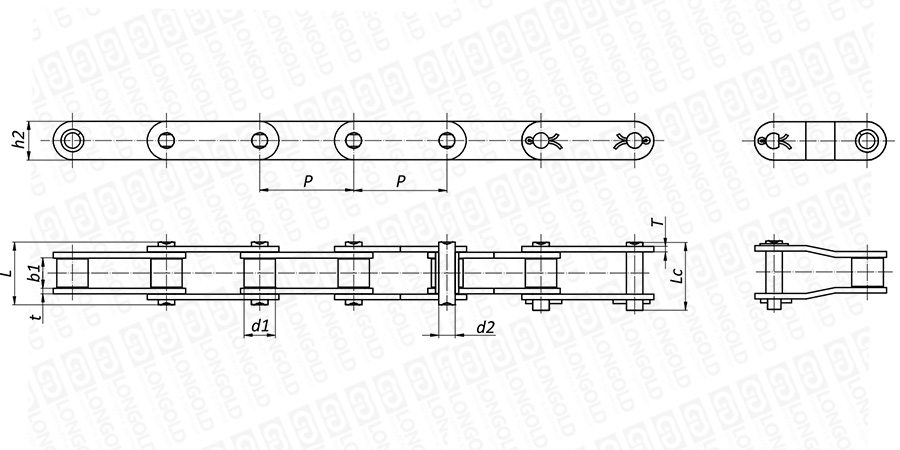 上圖為不銹鋼雙倍節(jié)距鏈直板型帶小滾子本體的結(jié)構(gòu)圖。