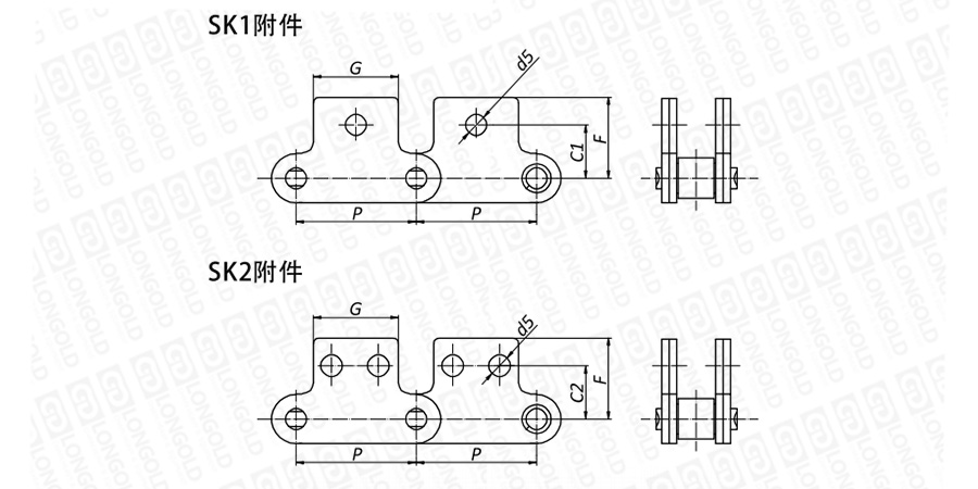 鏈條兩側(cè)鏈板向上延伸,延伸的附板成為附件,附板上帶1個或2個螺孔,附件表示為:SK1、SK2。