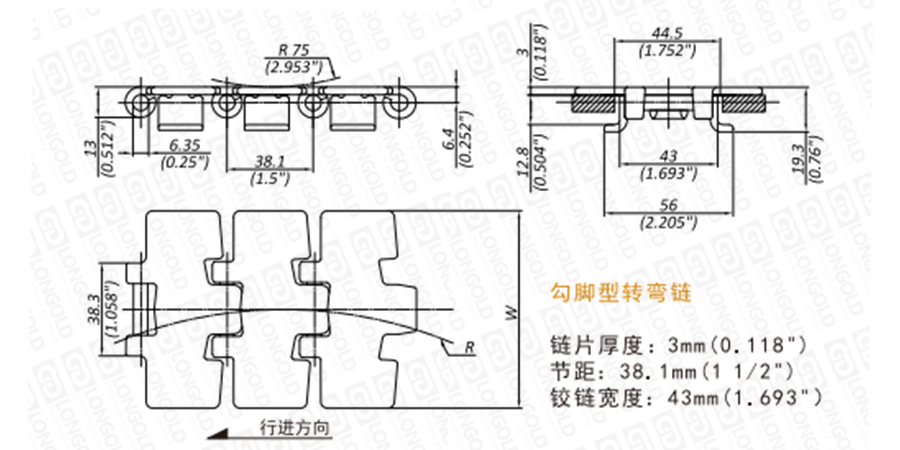 上圖為LD982T系列側(cè)彎鏈的結(jié)構(gòu)圖,圖紙已標(biāo)明本體尺寸。