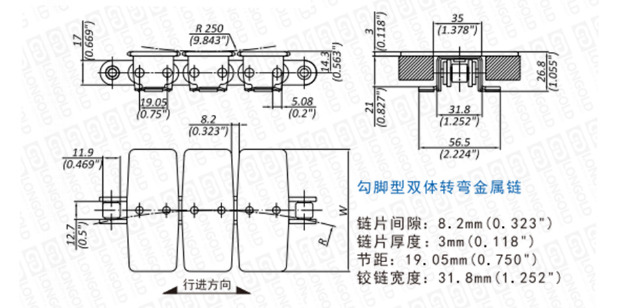 雙體鏈便于更換塑料節(jié),高機(jī)械強(qiáng)度,同單體鏈相比,即便是在負(fù)載條件下頻繁啟動(dòng)同樣可以長(zhǎng)距離傳送并減小拉伸。1874TM系列鏈條為勾腳型雙體轉(zhuǎn)彎金屬鏈條,基鏈節(jié)距為19.05毫米。相對(duì)于1874T系列,1874TM系列鏈條的鏈片間距縮短為5.7毫米。