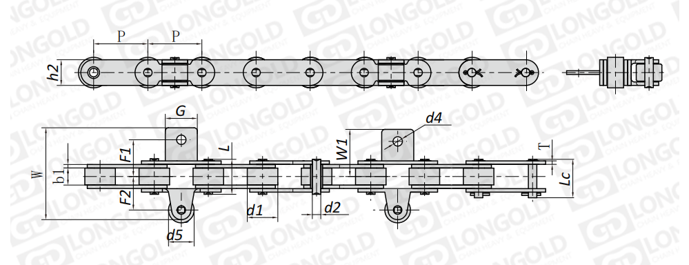 附件可配裝在每一個(gè)鏈節(jié)以上的鏈節(jié)間隔,如每偶數(shù)鏈節(jié)安裝,為了容易進(jìn)行保養(yǎng),安裝在外鏈節(jié)。