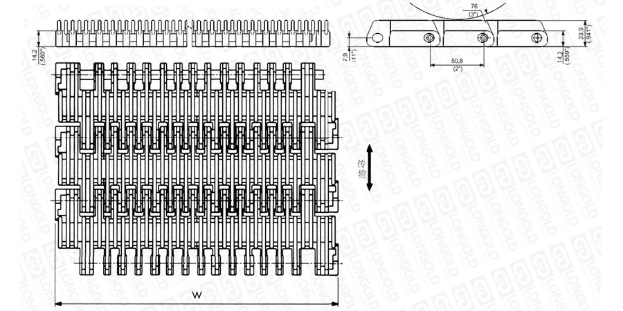 上圖為2"節(jié)距重載凸肋網(wǎng)帶 3110系列的結構圖,圖紙中已標明部分尺寸。