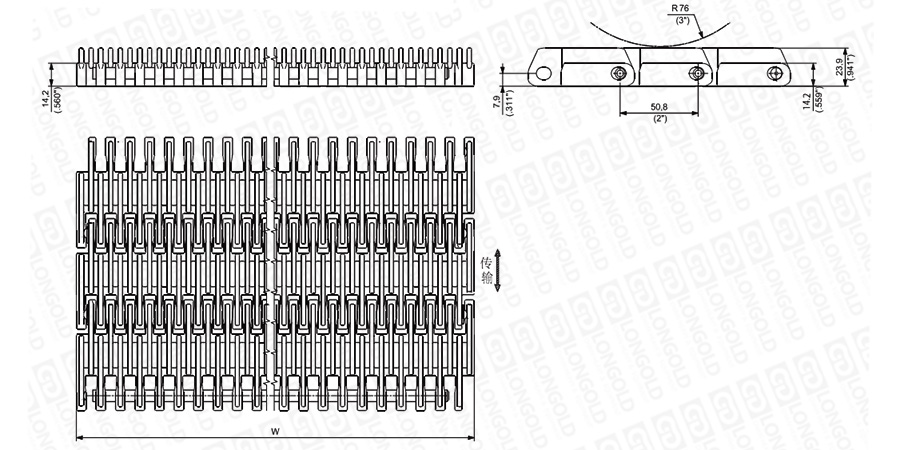 上圖為2"節(jié)距重載凸肋網(wǎng)帶 3125系列的結(jié)構(gòu)圖,圖紙中已標(biāo)明部分尺寸。