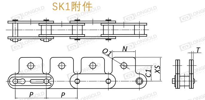 SK2附件,鏈條的兩側(cè)鏈板延伸,且附板上帶兩個孔的附件形式。