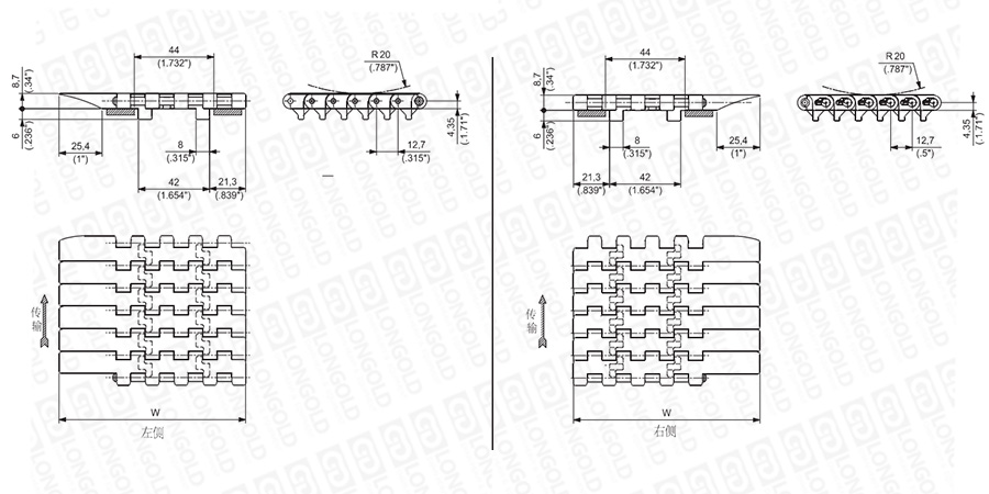 上圖為1/2"節(jié)距鏈板 600G ATM系列,圖紙中已標(biāo)明部分尺寸。
