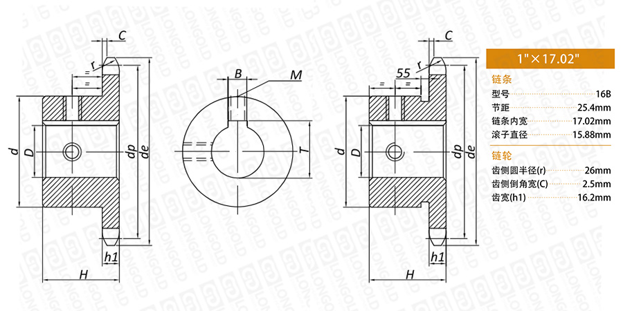 成品孔鏈輪,安裝(聯(lián)結(jié))后無背隙,由于采用軸向固定,不需要“防止脫落具”,定位準(zhǔn)確,鏈輪孔已經(jīng)加工完成,可直接安裝使用,配用LD16B-1單排鏈條。