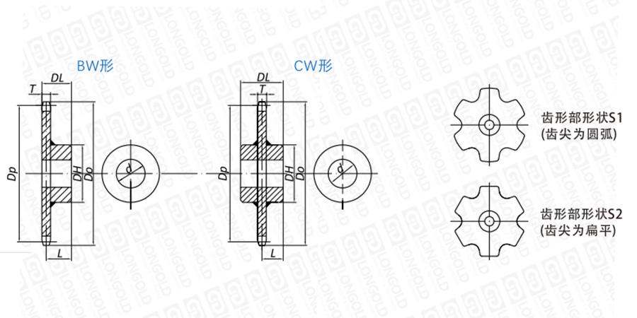 是在鏈輪齒形部的兩側(cè)焊接凸臺的形式。適用于LDC10150以下或LDC205以下尺寸的鏈條。 |