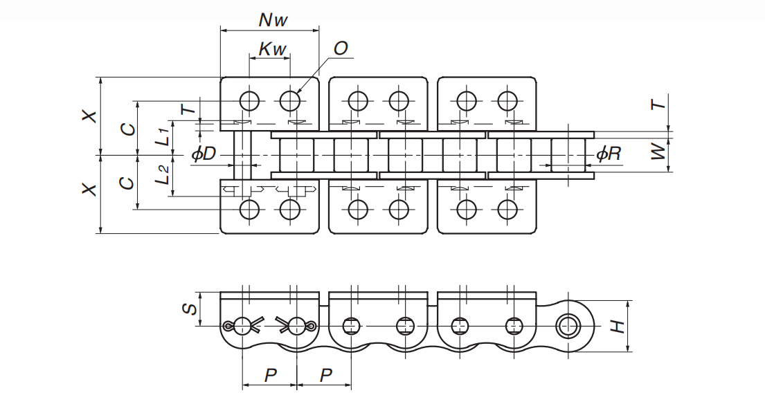 帶WK2附件的滾銷齒輪鏈條,即鏈條兩側帶加寬型折彎板,折彎板上帶兩個孔,可以安裝特定的部件來滿足鏈條工作的需求。