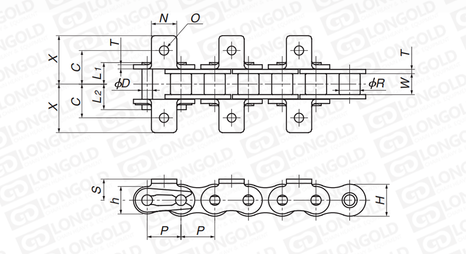 鏈條帶K1附件,即鏈條兩側帶折彎板,折彎板上各帶一個孔。
