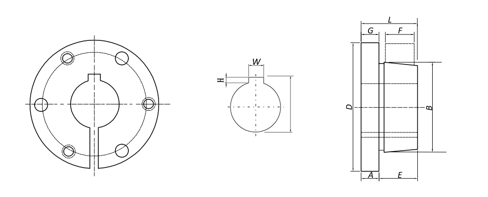 安裝:將螺栓穿過錐套法蘭上的鉆孔,然后擰緊到產品輪轂的螺紋孔中,將裝配松散的部件(錐度小的一端)滑到軸上的所需位置,均勻交替地擰緊每個螺栓。
