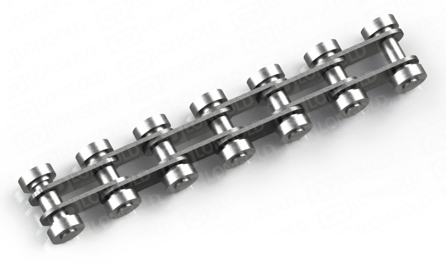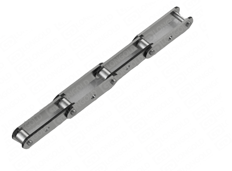 此種輸送鏈?zhǔn)怯呻p節(jié)距鏈條衍生而來(lái)的,鏈條節(jié)距為非常用規(guī)格,通過(guò)裝備特殊附件使鏈條滿足特定的工作需求