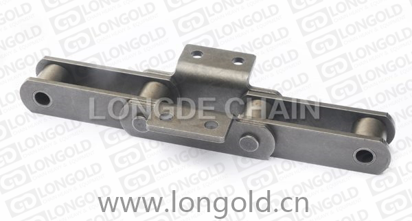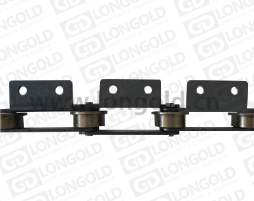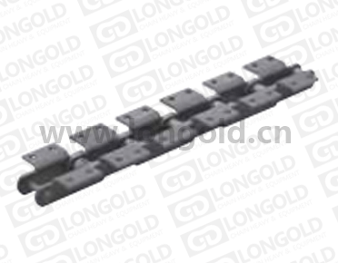 此種輸送鏈?zhǔn)怯呻p節(jié)距鏈條衍生而來(lái)的,鏈條節(jié)距為非常用規(guī)格,通過(guò)裝備附件使鏈條滿足特定的工作需求.