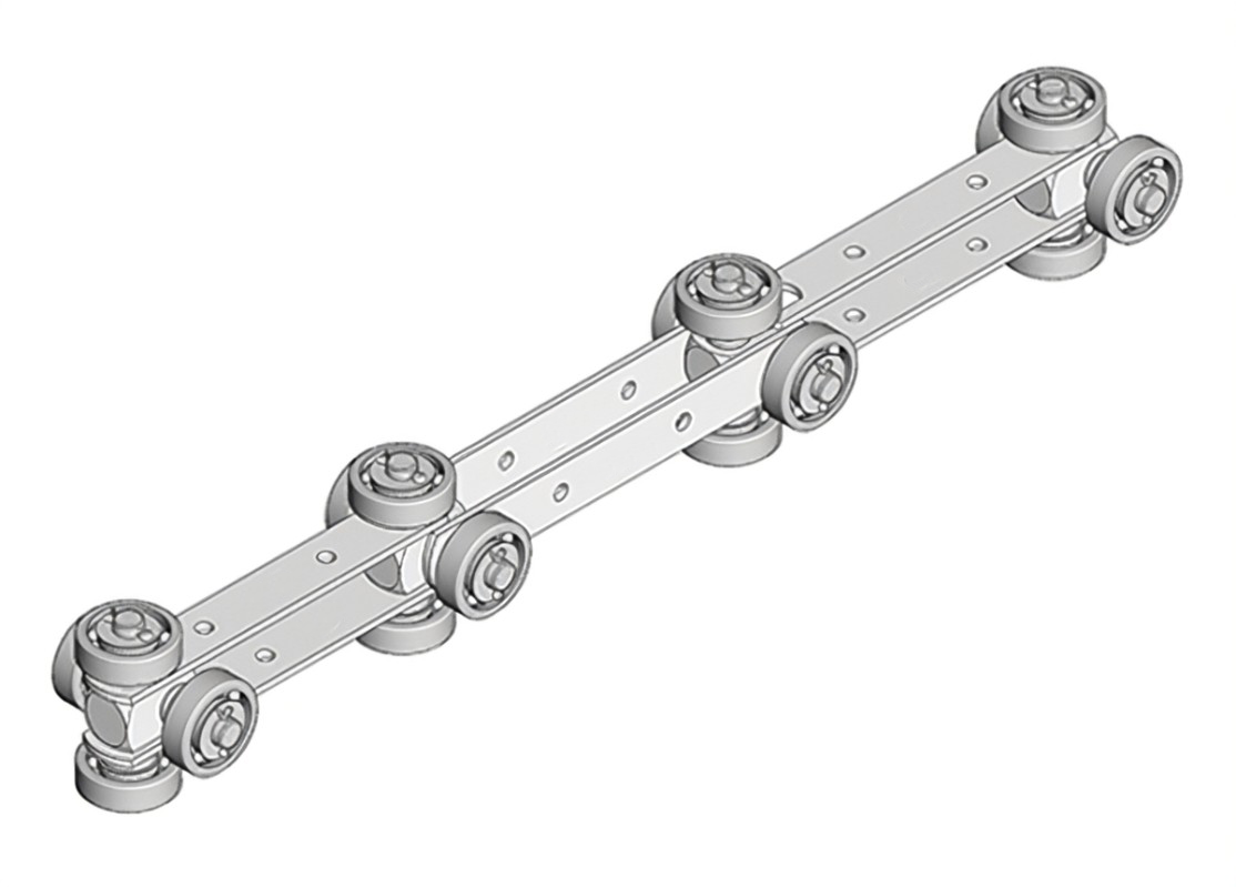 雙鉸接輸送鏈條設(shè)計(jì)用于能夠在空間范圍內(nèi)沿彎曲封閉軌道平穩(wěn)運(yùn)行的輸送系統(tǒng),常見于輕型封閉軌懸掛輸送機(jī)。它的結(jié)構(gòu)允許在多個(gè)方向上靈活移動(dòng),適用于復(fù)雜的輸送路線。
