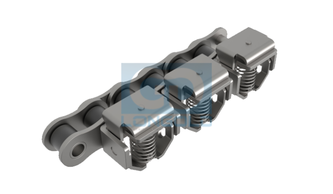 帶水平回轉(zhuǎn)型特殊附件的高性能板材、薄膜輸送用鏈條。夾持鏈條使用了簡(jiǎn)易斷開(kāi)和連接的特殊形狀的鉚釘,因此鏈長(zhǎng)容易調(diào)節(jié),從而縮短停機(jī)時(shí)間,提高了生產(chǎn)效率。