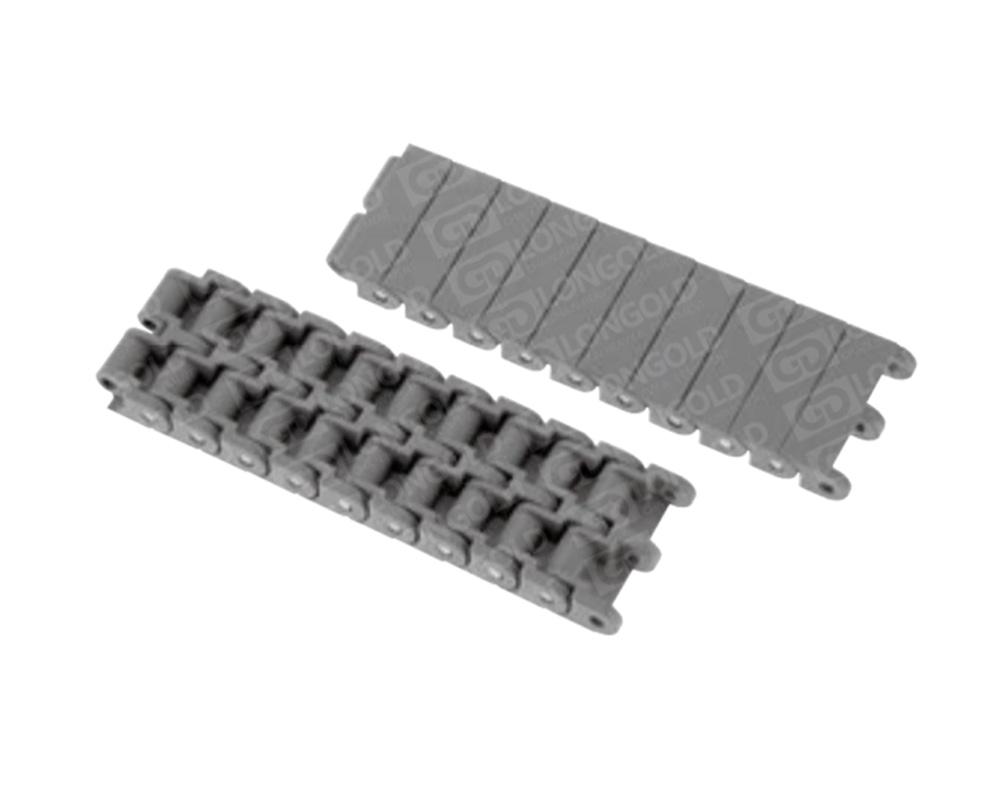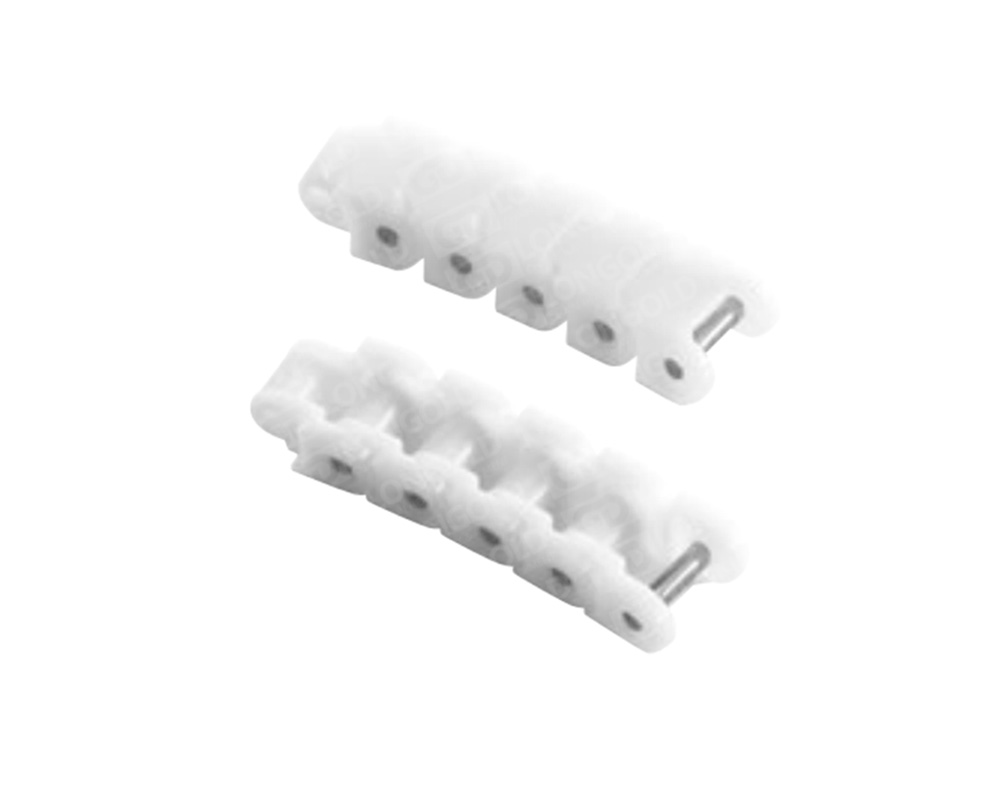 頂板鏈的鏈板通常比較寬大且厚實,其形狀多為平板狀。LSP60鏈條的側彎鏈形式,用于曲線輸送機。 銷軸有不銹鋼銷型和塑料銷型