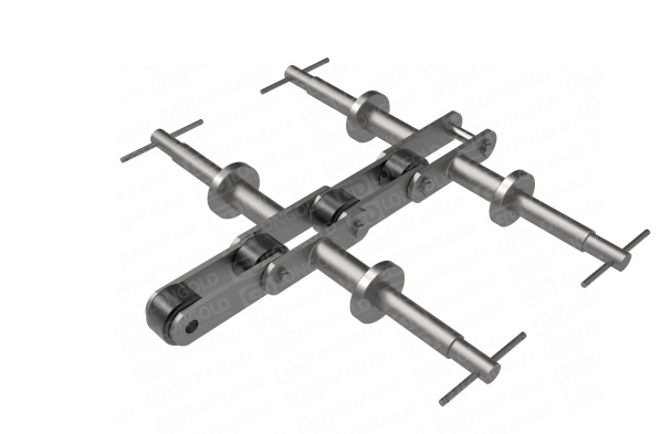 專門用于手套大型先進(jìn)流水線生產(chǎn)的輸送鏈條,兩側(cè)附件的軸延長(zhǎng),適合更長(zhǎng)尺寸手套的生產(chǎn)。