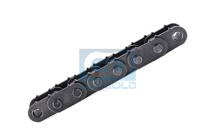 采?ANSI標準/ISO標準滾?鏈,并與鏈輪嚙合傳動,鏈板所帶的尖??于夾持?材輸送,?該類型鏈條可實現(xiàn)鏈條和物料同步運行,即夾帶帶狀物品時進行輸送。廣泛應(yīng)用于紡織機械。