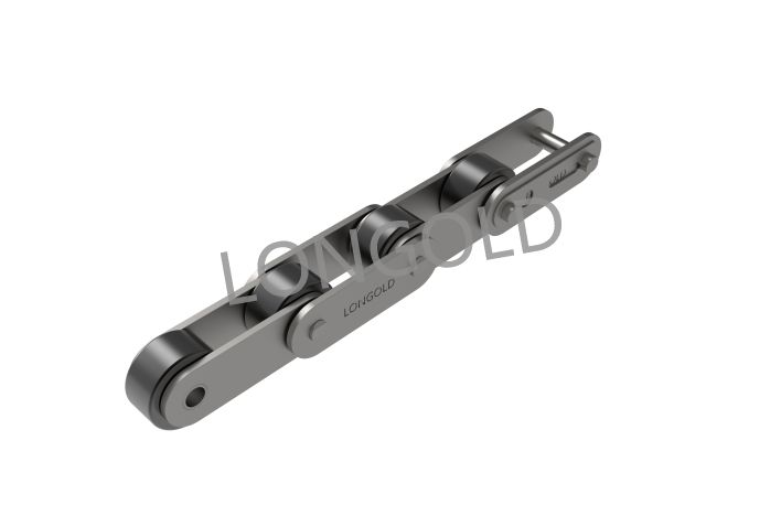 與短節(jié)距A系列滾?鏈條相?,鏈條節(jié)距增加1倍(稱為雙倍節(jié)距),鏈板形狀為直板形,鏈條的滾子分為S型滾子和R型滾子,且?guī)Ц郊妮斔?鏈條。