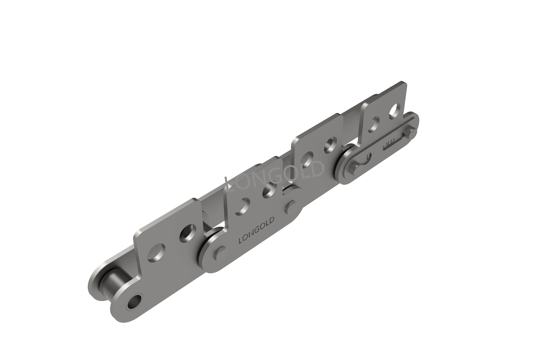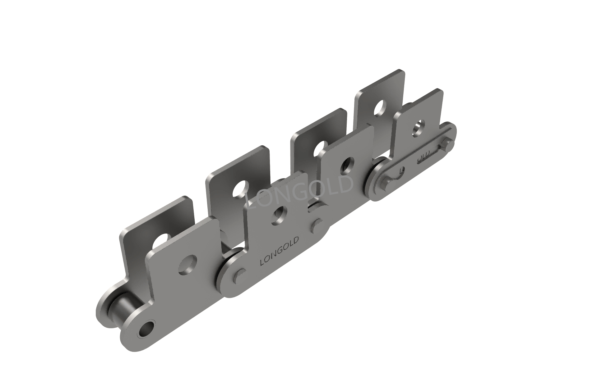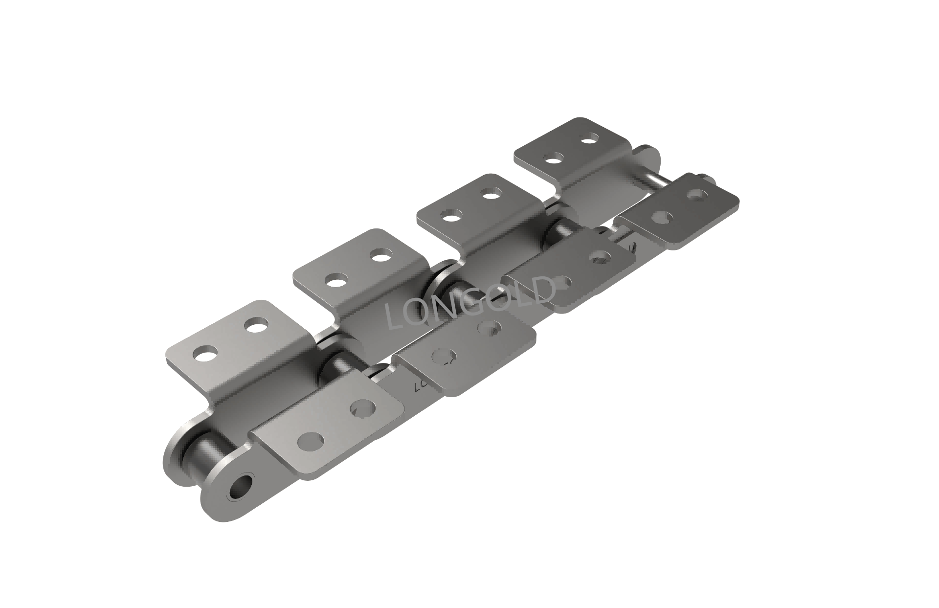 與短節(jié)距A系列滾?鏈條相?,鏈條節(jié)距增加1倍(稱為雙倍節(jié)距),鏈板形狀為直板形,鏈條的兩側(cè)帶有彎板附件,且附件上有一個(gè)螺孔的形式。依照J(rèn)IS,ISO和ASME標(biāo)準(zhǔn)。