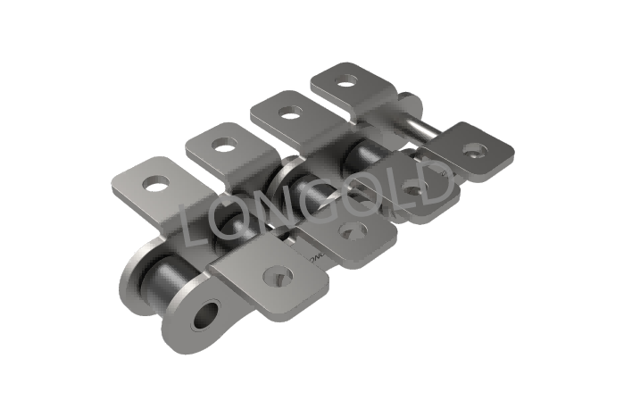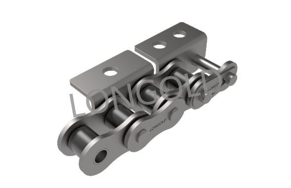 標(biāo)準(zhǔn)短節(jié)距A系列滾子鏈(傳動(dòng)用)型的鏈板上安裝了附件的鏈條。適用于短距離(通常10m以下)輸送,通常使用小節(jié)距鏈條輸送小型零部件。也適用于低噪音等環(huán)境。