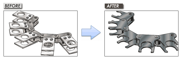 通過夾具和鏈條一體化,削減加工·安裝及設計板金的工時。 精簡供應商,裝置小型化及提高定位精度做貢獻。