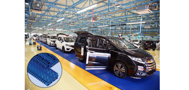因具有輕量,使用簡(jiǎn)單,可進(jìn)行部分更換,維修容易的優(yōu)點(diǎn)而被采用。 可保持塑料模塊鏈條的最大容許張力(62kN/m),高剛性鏈條。即使裝載汽車也不會(huì)斷裂。鏈條表面采用特殊凹凸構(gòu)造,可防止作業(yè)人員滑倒。表面沒有突起,可防止因作業(yè)臺(tái)車顛簸引起的工具掉落。塑料特有的低回彈性質(zhì)還可減輕作業(yè)人員的腳部的負(fù)擔(dān)。 與鋼制鏈條的輸送機(jī)相比,噪音低。 |