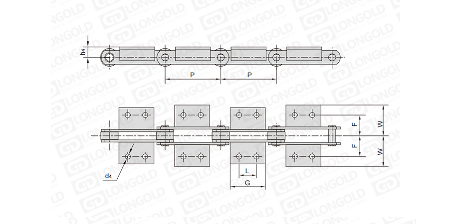 鏈條節(jié)距為非常用規(guī)格,裝配類似A1/A2或K1/K2的附件,用于物料的輸送。