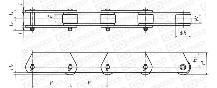 該鏈條是較為常用的一種輸送鏈條形式,如有需求,請咨詢隆德技術人員。